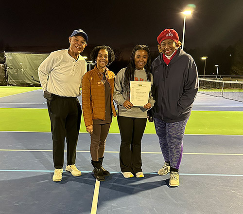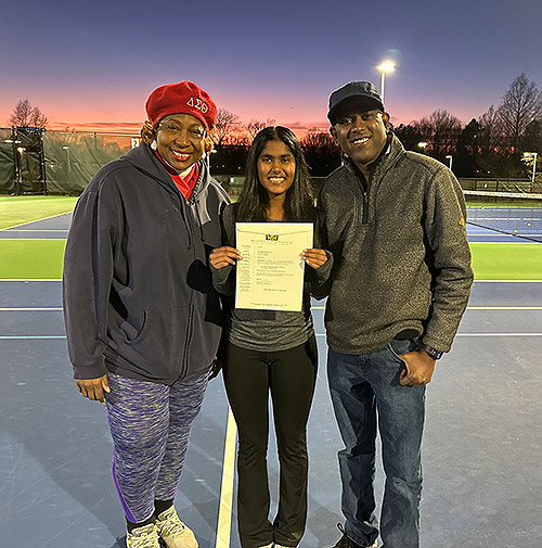 The James Lewis Education and Tennis Foundation awarded two tennis scholarships to Madison Sullen (pictured above-$500) and Ranidi Nagodawithana (pictured below-$700) on Monday, 2/19/24. Felicia Johnson, Scholarship Chairperson, awarded the scholarships. Congratulations to Madison and Ranidi who are both honor students!!